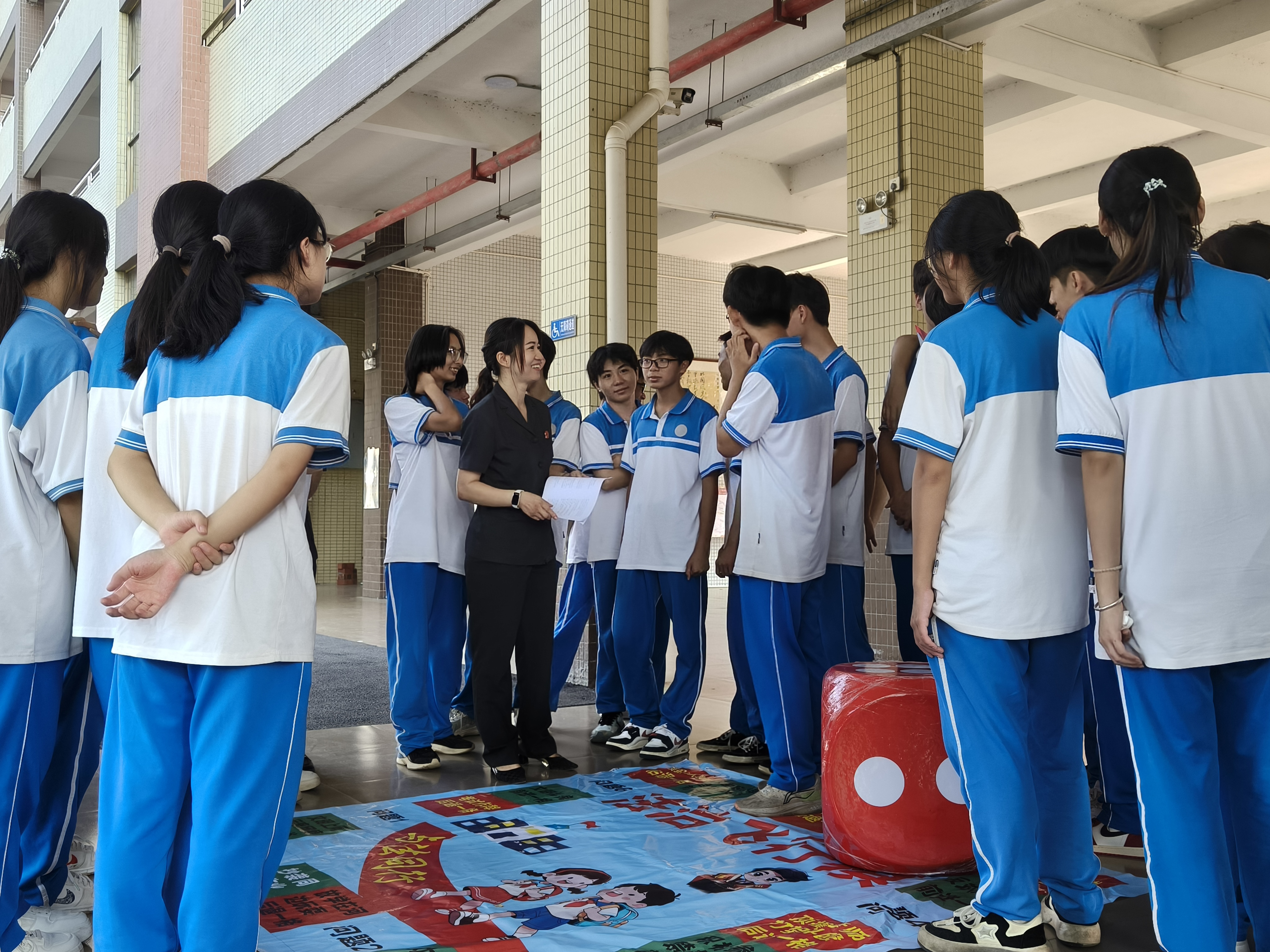 为打破传统普法形式的单调性,怀集法院创新设计了“法治飞行棋”互动游戏。巨型棋盘上,每一步都对应一道法律知识题或情景判断题,同学们在赖晓华法官的指引下,通过答题、模拟场景演练等方式前进。同学们争先参与游戏,现场氛围热烈,笑声与掌声不断。初二学生小李兴奋地说:“原来法律知识可以这么有趣,我记住了好多实用的知识!”